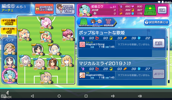 ≪2019年9月1日≫ 美少女育成サッカーゲームアプリ『ビーナスイレブンびびっど!』で9月2日から始まるイベント「びびびfeat.初音ミク マジカルミライ2019」の招集メンバーです。 GK 舞姫ゆらら(8855試合0点) DF 鳳来ありさ(565試合69点) ※特効 嫋八女ふみ(16375試合375点) エヴァ(20046試合497点) ヴァレリー(19553試合673点) MF ビャクシニ(11047試合76点) 鳴海りな(8765試合4点) プラチナ(11647試合367点) 谷城かなみ(7353試合28点) 口口ロロロ(3510試合11点) FW アンナマリア(567試合907点) ※特効&パネル 控え 飯綱みれい(8505試合78点) 小松菜れな(13321試合2050点) 初音ミク(0試合0点) ※特効&パネル 前イベントから連続で特効の鳳来ありさ選手に加え、新たに特効は2選手を編成。 アンナマリア選手はダイレクトシュート、ドリブルに加え今回のシュートで高倍率衣装が確保できたのでマイチームに編入することも検討中です。 | ||