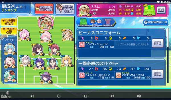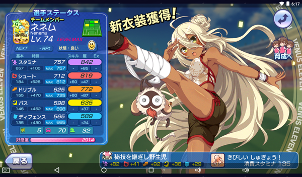 ≪2019年9月13日≫ 美少女育成サッカーゲームアプリ『ビーナスイレブンびびっど!』で9月14日から始まるイベント「蹴球拳」の招集メンバーです。 GK ミラ(6113試合0点) DF 飯綱みれい(8796試合81点) 重野ゆうか(7501試合94点) エヴァ(20336試合497点) ヴァレリー(19843試合673点) MF リリス(8300試合54点) 楽々浦るい(1141試合69点) 万束シャロン(2859試合971点) 小松菜れな(13612試合2051点) アンナマリア(857試合1535点) FW ネネム(4879試合3070点) ※特効 控え 瓜河ぱるこ(2201試合0点) 青葉ユズ(7772試合30点) 時乃ゆか(6643試合26点) 推しの飯綱みれい選手の新衣装が入ったVIVIdTOWNやイレブンスカウトなどと重なってしまったため、イベントスカウトは10連1回のみで、辛うじてネネム選手が来てくれました。 | ||