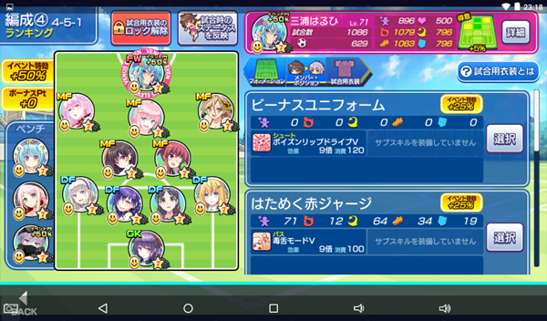≪2019年10月3日≫ 美少女育成サッカーゲームアプリ『ビーナスイレブンびびっど!』で10月4日から始まるイベント「Does utopia exist?」の招集メンバーです。 GK ミラ(6449試合0点) DF 飯綱みれい(9258試合90点) 重野ゆうか(7808試合94点) エヴァ(20805試合498点) ヴァレリー(20312試合674点) MF リリス(8636試合56点) 楽々浦るい(1412試合72点) 万束シャロン(3130試合1271点) 小松菜れな(14045試合2056点) アンナマリア(1158試合1803点) FW 三浦はるひ(1086試合629点) ※特効 控え 一色かおる(204試合4点) ※特効 青葉ユズ(8079試合30点) 時乃ゆか(6950試合26点) 特効以外はお馴染みのラインアップになりました。 “エヴァレリ”は対で配置するのが拘りです(笑) | ||