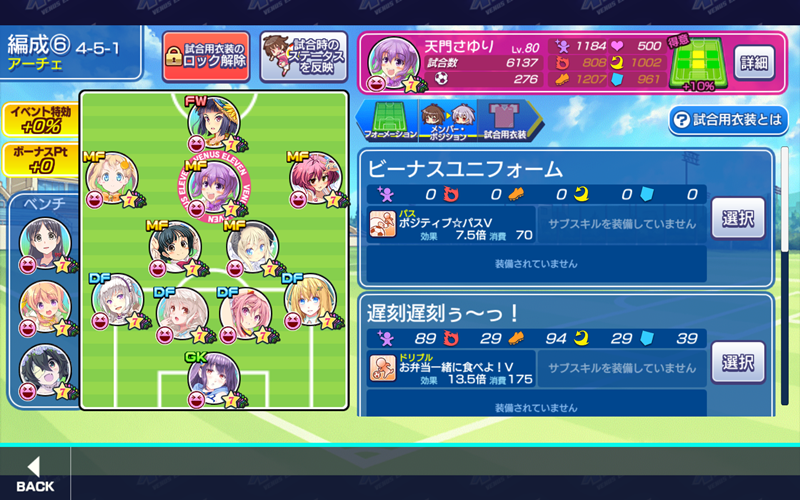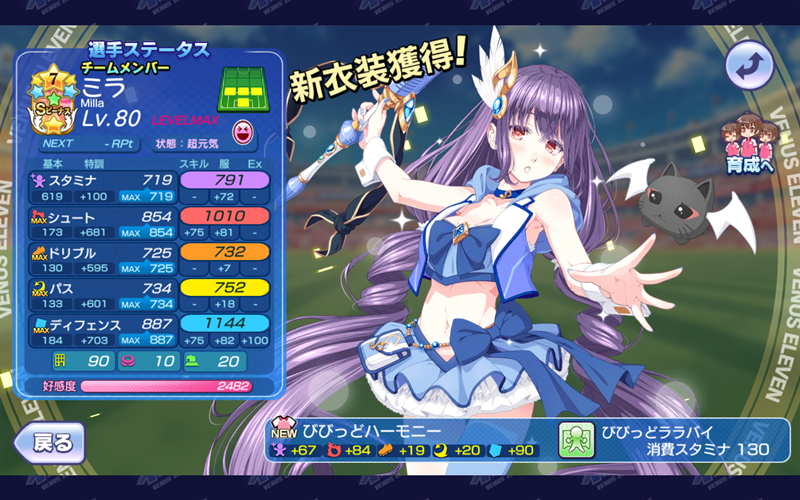 ≪2019年11月22日≫ 美少女育成サッカーゲームアプリ『ビーナスイレブンびびっど!』で11月23日から始まるイベント「劇場版ピュアびびっど!オールスターズ〜みんなで行こう!ドリーミングパーク♪〜」の招集メンバーです。 GK ミラ(6999試合0点) ※特効 DF 黛エリカ(181試合0点) ※ボーナス 嫋八女ふみ(17750試合376点) エヴァ(21844試合498点) ヴァレリー(21351試合675点) MF ビャクシニ(12011試合76点) 鳴海りな(9800試合33点) 天門さゆり(6137試合276点) ※特効 谷城かなみ(8566試合34点) ソナタ(11255試合639点) ※特効 FW 速水つばさ(12884試合18389点) 控え ロトン(11737試合15点) ※微特効 中森こむぎ(185試合0点) ※特効 飯綱みれい(10356試合93点) 特効、微特効、ボーナスといつも以上に豪華なラインアップとなりました。 天門さゆり選手とソナタ選手はかつてはメインメンバーとして起用をしていたので、かなり経験を積んでもいます。 | ||