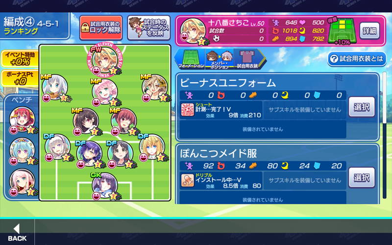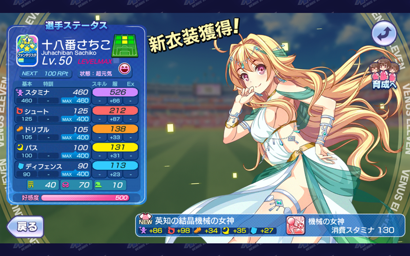 ≪2019年12月2日≫ 美少女育成サッカーゲームアプリ『ビーナスイレブンびびっど!』で12月4日から始まるイベント「ギリシアの休日」の招集メンバーです。 GK ミラ(7246試合0点) DF 飯綱みれい(10599試合93点) 重野ゆうか(8247試合94点) エヴァ(22066試合498点) ヴァレリー(21573試合675点) MF リリス(9258試合56点) 楽々浦るい(2028試合155点) 万束シャロン(3746試合1776点) 小松菜れな(15001試合2071点) ロシータ(0試合0点) FW 十八番さちこ(0試合0点) ※特効 控え 青葉ユズ(8669試合31点) 時乃ゆか(7515試合26点) 相崎るみ(3021試合2599点) 400名以上もの魅力的な選手が登場するゲームなので、今回からランキングイベントに限っては今まで出場機会の少なかった選手を抜擢してみようかなとロシータ選手がメンバー入りしています。 | ||