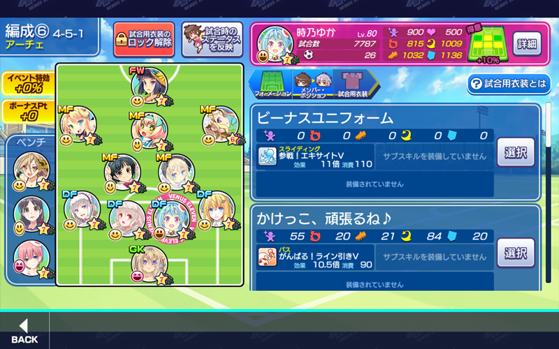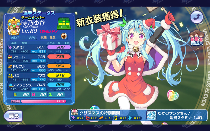 ≪2019年12月23日≫ 美少女育成サッカーゲームアプリ『ビーナスイレブンびびっど!』で12月24日から始まるイベント「五人分のクリスマス」の招集メンバーです。 GK 舞姫ゆらら(9787試合0点) DF 時乃ゆか(7787試合26点) ※特効&ボーナス 嫋八女ふみ(18293試合376点) エヴァ(22498試合498点) ヴァレリー(22005試合675点) MF ビャクシニ(12346試合76点) 鳴海りな(10343試合102点) プラチナ(12739試合368点) ルシール(191試合1点) ※ボーナス 口口ロロロ(4447試合12点) FW 速水つばさ(13468試合19330点) 控え 中野一花(0試合0点) ※特効&ボーナス 飯綱みれい(11045試合97点) 小松菜れな(15427試合2077点) 『五等分の花嫁』との2度目のコラボイベントです。 特効の中野一花選手はGKなので、後半開始からか終了直前の投入になります。 | ||