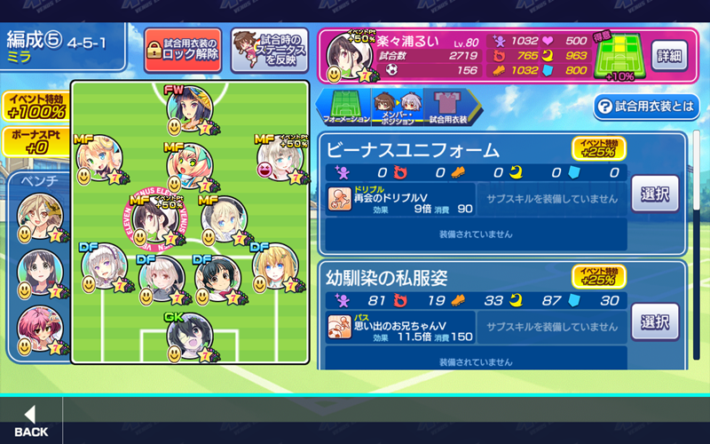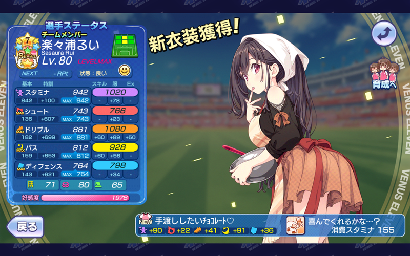 美少女育成サッカーゲームアプリ『ビーナスイレブンびびっど!』で2月13日から始まるイベント「Be my Valentine」の招集メンバーです。 GK ロトン(12744試合15点) ※ボーナス DF 鳴海りな(11354試合133点) 嫋八女ふみ(19446試合450点) ※ボーナス エヴァ(23627試合500点) ヴァレリー(23098試合676点) MF ビャクシニ(12939試合76点) 楽々浦るい(2719試合156点) ※特効 プラチナ(13332試合368点) アンドレ(29試合0点) ※特効 口口ロロロ(5040試合12点) FW 速水つばさ(14351試合21133点) 控え 飯綱みれい(11749試合98点) 小松菜れな(16131試合2246点) 谷城かなみ(9267試合36点) 毎年恒例のバレンタインイベントが開始です。 ミラ杯は特効よりボーナス選手の方が大事なので、イレブンスカウトで嫋八女ふみ選手がGETできたのは嬉しいです。 | ||