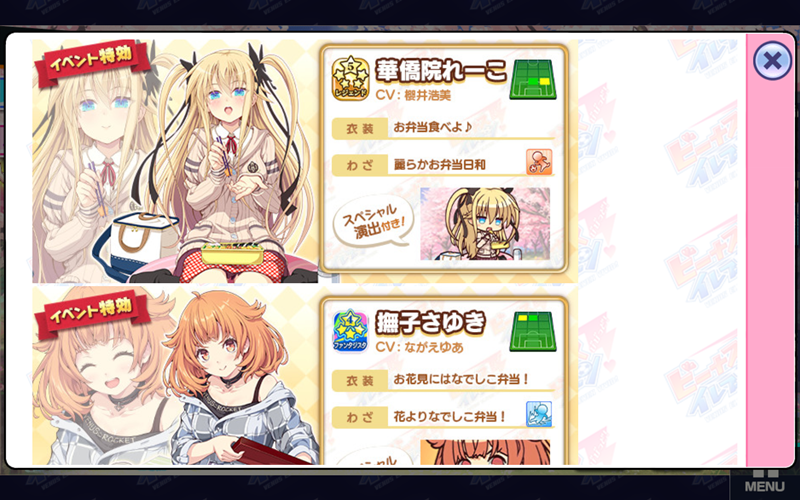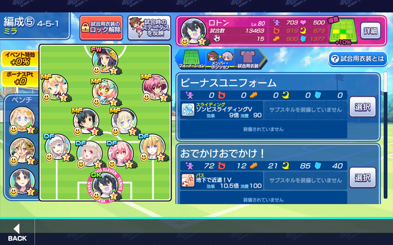 美少女育成サッカーゲームアプリ『ビーナスイレブンびびっど!』で4月14日から始まるイベント「桜うららかに春誘う」の招集メンバーです。 GK ロトン(13463試合15点) ※ボーナス DF ハッカ2号(8743試合15点) 嫋八女ふみ(20576試合455点) エヴァ(24928試合500点) ヴァレリー(24433試合676点) MF ビャクシニ(13711試合76点) 鳴海りな(12484試合156点) プラチナ(14104試合368点) 谷城かなみ(9849試合36点) 口口ロロロ(5403試合12点) FW 速水つばさ(15055試合22684点) 控え 飯綱みれい(14040試合103点) 小松菜れな(17990試合2562点) ソナタ(12756試合926点) 今回は贔屓の選手が特攻に含まれていなかったので、控えめにイベントスカウトを回しました。 案の定、特効選手は不在でイベントに臨むことになったので、まずは1枚目と2枚目のボードを全て開けることに専念です。 | ||