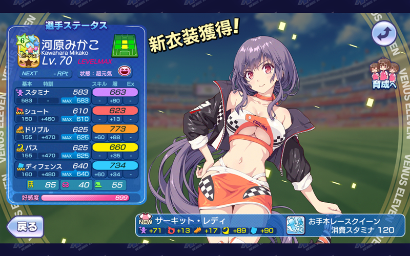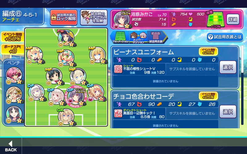 美少女育成サッカーゲームアプリ『ビーナスイレブンびびっど!』で4月24日から始まるイベント「爆走!?フィールドカーティング」の招集メンバーです。 GK 舞姫ゆらら(10610試合0点) DF 河原みかこ(714試合15点) ※特効 嫋八女ふみ(20804試合462点) 隠いたる(39試合1点) ※パネルボーナス ヴァレリー(24673試合676点) MF ビャクシニ(13898試合76点) 鳴海りな(12712試合165点) プラチナ(14291試合368点) エヴァ(25168試合500点) 口口ロロロ(5590試合12点) FW 速水つばさ(15295試合23186点) 控え 飯綱みれい(14268試合103点) 小松菜れな(18218試合2571点) 谷城かなみ(10036試合36点) 特効もパネルボーナスも1選手ですが準備できたものの、特効衣装のスキルが守備系なのがかなり痛い。。。 サブスキルにパスを付けたかったですが、高倍率を所持していないために断念しました。 | ||