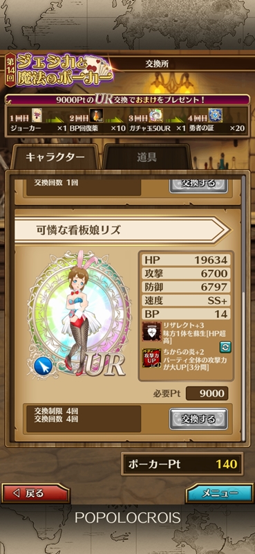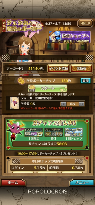 『ポポロクロイス物語 ナルシアの涙と妖精の笛』は14回目となるジェシカと魔法のポーカーのイベントが開催されました。 もう14回目になるのですね、、、まぁナル笛はイベントの種類が少ないので仕方ないですが。。。 今回、イベントで取り上げられたのはロマーナ騎士団のリズでした。 ポーカーイベントでは某イベントのテカテカスーツみたいに度肝を抜くような衣装ではなく、雰囲気にマッチしたものなので(笑)、今回はバニーということでかわいく仕上がっています。 以前はポーカーチップがなかなか集まらず、集まったところで運任せのイベントだったので、ゴールの計算が立てにくかったですが、仕様も変わりチップが集めやすくなったことで戦略も変わりました。 池ちょんはスリーカード狙いで、あわよくばフルハウスになれば良いなぁ的な感じでポイントをコツコツ貯めるようになりました。 さて、明日はナル笛2周年です。 いろいろと動きはありそうなので、そのあたりの戯言も書こうかな。 |