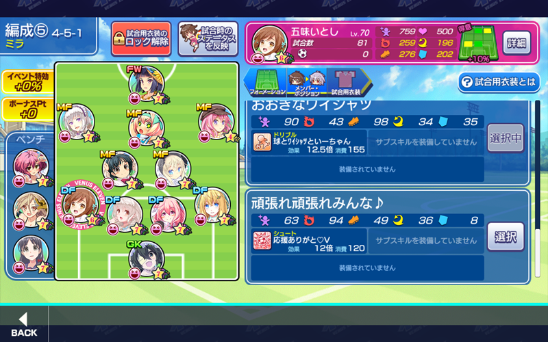 美少女育成サッカーゲームアプリ『ビーナスイレブンびびっど!』で5月14日から始まるイベント「My Darling」の招集メンバーです。 GK ロトン(13899試合15点) ※ボーナス DF ハッカ2号(8930試合15点) 嫋八女ふみ(21196試合476点) エヴァ(25537試合500点) 五味いとし(81試合0点) ※ボーナス MF ビャクシニ(14082試合76点) 鳴海りな(13224試合262点) プラチナ(14475試合368点) 真堂ひとみ(0試合0点) ※ボーナス ヴァレリー(25042試合676点) FW 速水つばさ(15504試合23603点) 控え 飯綱みれい(14878試合103点) 小松菜れな(18770試合2841点) 谷城かなみ(10220試合36点) ミラ杯の時はイレブンスカウトに力を入れすぎて、イベントスカウトを回せないことが多々ありますね(汗) 今回も特効はなしですが、ボーナス対象が3選手いるのでゴールドを貯めるイベントになりそうです。 | ||