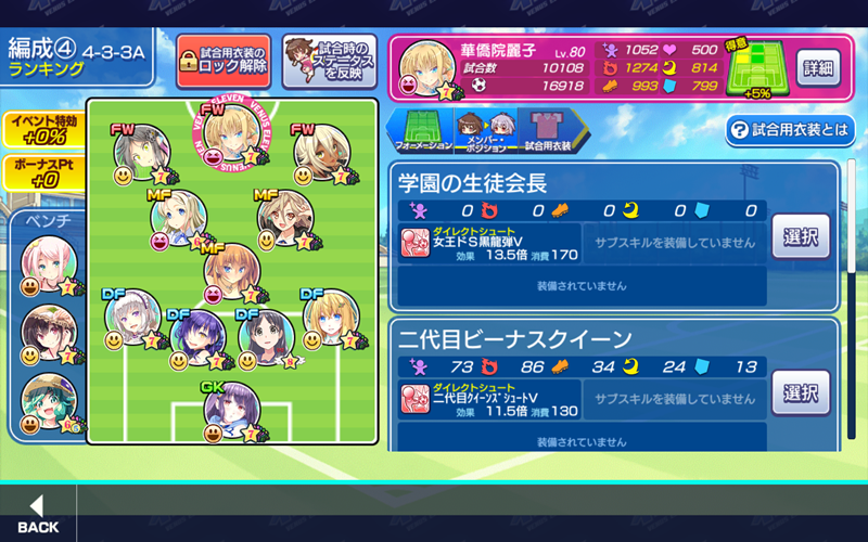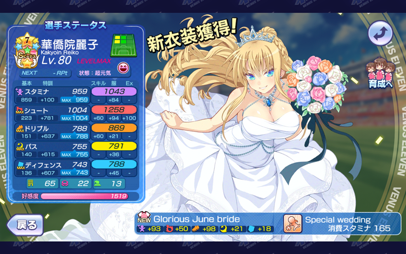 美少女育成サッカーゲームアプリ『ビーナスイレブンびびっど!』で6月4日から始まるイベント「純白ドレスはキケンな香り」の招集メンバーです。 GK ミラ(9049試合0点) DF 飯綱みれい(15460試合104点) 重野ゆうか(10252試合98点) エヴァ(25921試合500点) ヴァレリー(25426試合676点) MF クリスティナ(8244試合529点) ※特効 小松菜れな(19272試合2911点) ヨハンナ(0試合0点) FW 華僑院麗子(10108試合16918点) ※特効 ネネム(7130試合5241点) 詩奏音ことば(8156試合6166点) 控え 瓜河ぱるこ(4310試合0点) 楽々浦るい(4216試合473点) 青葉ユズ(9958試合32点) 今回は上位報酬にトップチームで起用している詩奏音ことば選手の新衣装があるので頑張りたい気持ちもありますが…特効2人では厳しいかな。 特効として入手した華僑院麗子選手もクリスティナ選手も初期はトップチームで起用していたのでキャップ数は多めです。 | ||