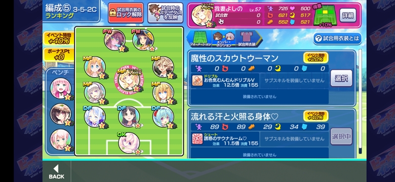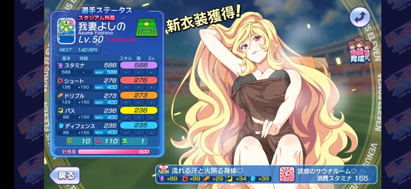 美少女育成サッカーゲームアプリ『ビーナスイレブンびびっど!』で11月4日から始まるイベント「乙女の悩みデトックス」の招集メンバーです。 GK リディアーヌ(2259試合355点) DF 飯綱みれい(20981試合104点) 時乃ゆか(10461試合88点) 柊木めい(7095試合3点) MF 我妻よしの(0試合0点) ※特効 エヴァ(28996試合500点) ヴァレリー(28501試合676点) 小松菜れな(22125試合4045点) ソナタ(14798試合1125点) FW 速水つばさ(17259試合26871点) アリス(6464試合4702点) 控え 青葉ユズ(10844試合38点) 楽々浦るい(5208試合850点) 万束シャロン(6144試合3423点) 5周年のビンゴタスクのために3−5−2Cのフォーメーションを採用して臨む今月のランキングイベントからドロップ選手のシステムがなくなったので、ただただ試合をすればよくなりました(笑) 個人的には終盤になって焦ることがなくなるので大歓迎。 ランキング報酬にマイチームのメンバーが含まれていなかったので、今月も“まったり”だと思っていたら、先月と同じ流れでスカパスが仕事をして特効は1選手だけですが確保できました。 5周年キャンペーンの一環でVHは多く配布されているので、イレブンスカウトにお気に入りの選手が来れば頑張ろうかな!? | ||