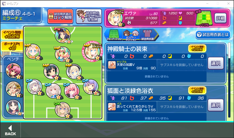 美少女育成サッカーゲームアプリ『ビーナスイレブンびびっど!』で1月25日から始まるイベント「Go!ピュアびびっど! V SIDE」の招集メンバーです。 GK 舞姫ゆらら(12099試合0点) DF ハッカ2号(10569試合15点) 嫋八女ふみ(24955試合528点) 乙坂あやな(219試合0点) ※パネル ヴァレリー(30573試合676点) MF ビャクシニ(16794試合76点) 鳴海りな(17905試合413点) プラチナ(16565試合371点) エヴァ(31068試合577点) ※特効 ソナタ(15690試合1163点) FW 速水つばさ(18977試合30674点) 控え 飯綱みれい(24351試合106点) 小松菜れな(23602試合4467点) 谷城かなみ(12725試合38点) 久しぶりのピュアびびっど!にスポットライトを当てたイベントのようです。 ただ今回はスポ根側がメインではないようで、俗に言うスピンオフというやつですね。 | ||