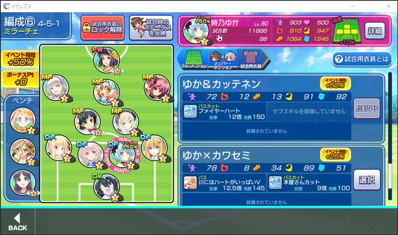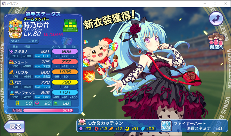 美少女育成サッカーゲームアプリ『ビーナスイレブンびびっど!』で2月22日から始まるイベント「びびモントーナメント!」の招集メンバーです。 GK ロトン(16555試合15点) DF 時乃ゆか(11886試合88点) ※特効 嫋八女ふみ(25337試合531点) エヴァ(31740試合806点) モルガン(479試合1点) ※パネル MF ビャクシニ(17131試合76点) 鳴海りな(18577試合414点) プラチナ(16902試合371点) 谷城かなみ(13090試合38点) ヴァレリー(31245試合677点) FW 速水つばさ(19545試合31961点) 控え 飯綱みれい(24865試合106点) 小松菜れな(24116試合4655点) ソナタ(16072試合1168点) つまりは「びびモンGETだぜ!」とでも言えばいいのですかね(笑)? 今まではGKをイベント種類ごとに使い分けていましたが、ロトン選手のSビーナススキルを付け替えてミラ杯もアーチェ杯も兼用できるようにしました。 | ||