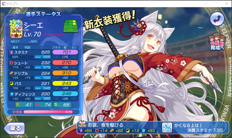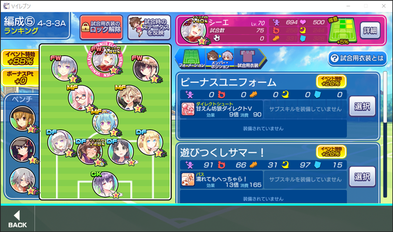 美少女育成サッカーゲームアプリ『ビーナスイレブンびびっど!』で3月4日から始まるイベント「什宝護忍娘」の招集メンバーです。 GK ミラ(10683試合0点) DF 飯綱みれい(25055試合106点) 唐沢みずき(220試合0点) ※特効 エヴァ(31997試合828点) ヴァレリー(31502試合677点) MF 時乃ゆか(12143試合88点) 小松菜れな(24306試合4655点) 青葉ユズ(12286試合59点) FW シーエ(75試合0点) ※特効 楽々浦るい(6531試合1172点) 熊田ミキ(6846試合1751点) 控え アセシナ(0試合0点) 常法あいみ(0試合0点) 峰みつき(0試合0点) 作戦名はドラクエで言うところの「ガンガンいこうぜ」ということで、FWとMFは全てシュートスキルを設定しました。 エヴァ選手もシュートスキルですが、さすがに右SBでは得点できないかな。 そして選手交代はしないので、控えにこれまで未出場の選手たちを並べることにしました。 | ||