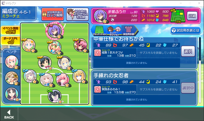 美少女育成サッカーゲームアプリ『ビーナスイレブンびびっど!』で3月24日から始まるイベント「閃乱ビビッド MIDNIGHT RIOT」の招集メンバーです。 GK ロトン(16980試合15点) DF ハッカ2号(11080試合15点) 嫋八女ふみ(25762試合536点) エヴァ(32416試合839点) ヴァレリー(31921試合677点) MF ビャクシニ(17495試合76点) 鳴海りな(19084試合438点) プラチナ(17266試合371点) 谷城かなみ(13454試合38点) ソナタ(16497試合1168点) FW 折節ふうか(303試合542点) ※ボーナス 控え 飯綱みれい(28672試合106点) 小松菜れな(24710試合4934点) 青葉ユズ(12705試合272点) もはや恒例のイベントとなった『閃乱カグラ』とのコラボが始まります。 今回が4回目となりますが、前回のイベントで過去のイベスカ排出のみの選手も含めて全てを入手するとスタメンがコラボ選手のみで組めるという驚きの事態が起きました。 そして、今回は新たに3選手が新規実装となったので…控え選手も含めて完全なるコラボチームの完成です(笑)! ちなみに今回の招集メンバーは、イベントスカウトを回していないこともあり、先週のイベントと全く同じにしました。 | ||