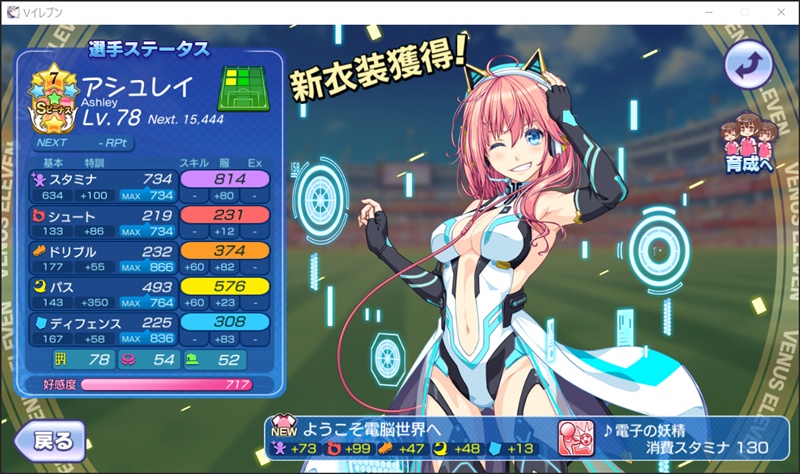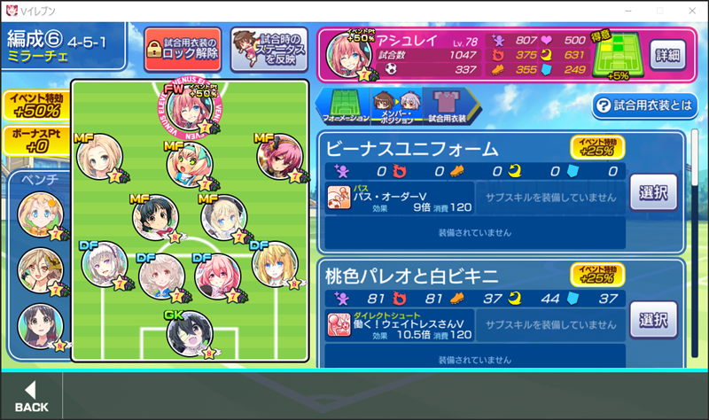 美少女育成サッカーゲームアプリ『ビーナスイレブンびびっど!』で4月24日から始まるイベント「ASSEMBLE!サイバーガールズ」の招集メンバーです。 GK ロトン(17425試合15点) DF ハッカ2号(11479試合15点) 嫋八女ふみ(26207試合537点) エヴァ(33074試合946点) ヴァレリー(32579試合677点) MF ビャクシニ(17894試合76点) 鳴海りな(19641試合444点) プラチナ(17665試合371点) 谷城かなみ(13816試合38点) 楸木まれ(407試合34点) ※パネル FW アシュレイ(1047試合337点) ※特効 控え 飯綱みれい(29367試合106点) 小松菜れな(25256試合5176点) ソナタ(16788試合1194点) 今月のアーチェ杯もミラ杯同様にパネルボーナスの楸木まれ選手をどう機能させるかが悩ましいところです。 とりあえず寿々花むつみ選手も全衣装でパネルボーナスが発揮できるようなので入れ替えの可能性も視野に入れています。 | ||