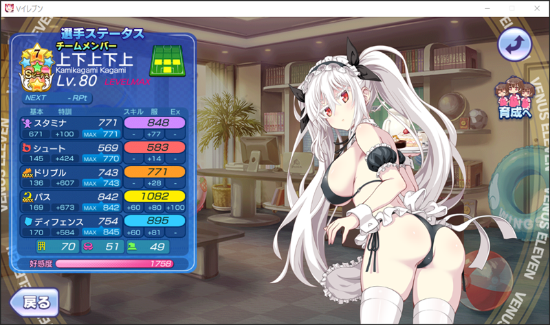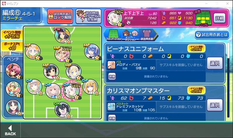 美少女育成サッカーゲームアプリ『ビーナスイレブンびびっど!』で7月25日から始まる復刻イベント「Beach Resolvers」の招集メンバーです。 GK ロトン(18800試合15点) ※ボーナス DF 上下上下上(7242試合126点) ※特効 嫋八女ふみ(27722試合622点) エヴァ(35176試合1149点) ヴァレリー(34681試合677点) MF ビャクシニ(18780試合76点) 鳴海りな(21547試合464点) 小松菜れな(27048試合5795点) ※微特効 早風ふうり(1313試合164点) ※ボーナス ソナタ(17980試合1260点) FW 速水つばさ(21533試合36203点) 控え 飯綱みれい(31503試合106点) プラチナ(18302試合371点) 谷城かなみ(14702試合38点) 推しの一人である小松菜れな選手が微特効のラインアップに入ったということで、確実に衣装を入手できるように引換券の付く有償イベスカを上下上下上選手がピックアップの日にチャレンジして、れな選手も下上選手もゲット! …ここまでは良かった。。。 翌日に重野ゆうか選手の衣装も欲しいなぁと思って、追加の10連をすると、、、下上選手が再び。。。 欲張りすぎた…。 | ||