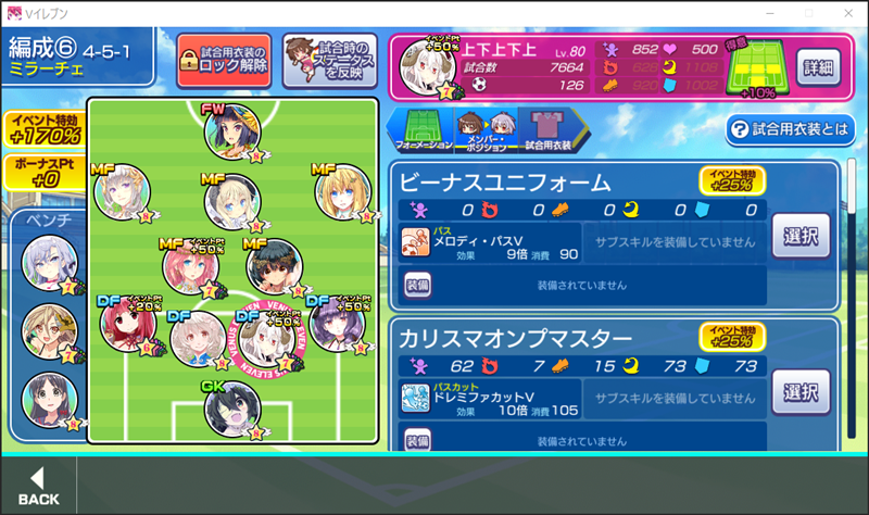 美少女育成サッカーゲームアプリ『ビーナスイレブンびびっど!』で10月25日から始まる復刻イベント「福怪夜行 〜現世と異界がつながる日…?〜」の招集メンバーです。 GK ロトン(20329試合16点) DF 上下上下上(7664試合126点) ※特効 嫋八女ふみ(28924試合654点) ミラ(13282試合0点) ※特効 華表裏りか(112試合12点) ※微特効 MF 鳴海りな(23512試合500点) ※パネル アシュレイ(1253試合640点) ※特効 ビャクシニ(19276試合76点) エヴァ(37163試合1730点) ヴァレリー(36627試合683点) FW 速水つばさ(22636試合39067点) 控え 飯綱みれい(43120試合108点) 小松菜れな(28701試合6324点) 御縁いおり(194試合0点) 福怪夜行は確かイベントシナリオの投票で上位に入った色んな意味で印象に残るお話でしたね。 一部のシーンは少しトラウマになったオーナーもいたりするのかも。。。 今回の目標はイベントシールで青葉ユズ選手と黒鋼アゲハ選手の新衣装を交換することです。 1500枚、、、コツコツやるしかないな! | ||