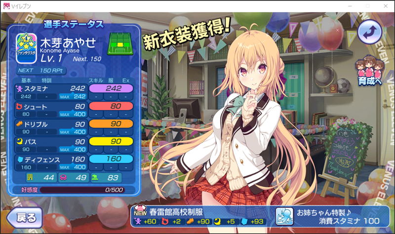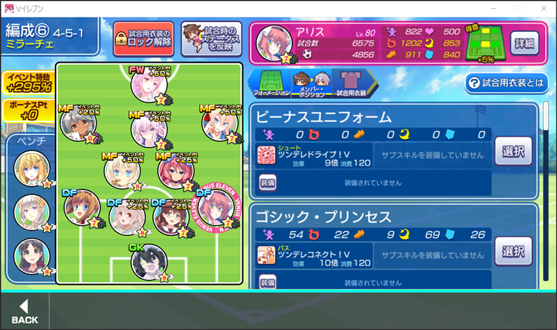 美少女育成サッカーゲームアプリ『ビーナスイレブンびびっど!』で11月14日から始まる復刻イベント「ようこそ、たのしいようちえん!? あやしい白衣とふしぎなおくすり」の招集メンバーです。 GK ロトン(20636試合16点) ※ボーナス DF 母天かすみ(1680試合12点) ※微特効 嫋八女ふみ(29231試合654点) ※微特効 アリス(6575試合4856点) ※シール 野咲あまね(37試合0点) ※ボーナス MF 矢張まとい(620試合226点) ※微特効 ビャクシニ(19668試合80点) ※特効 アルテミス(3986試合2389点) ※特効 黒鋼アゲハ(8241試合6762点) ※特効 エマ(3328試合114点) ※微特効 FW アンナマリア(2182試合3194点) ※特効 控え 飯綱みれい(47085試合109点) エヴァ(37681試合1841点) ヴァレリー(37145試合684点) 今回は1試合あたりのイベントシール11枚のラインアップで臨みます。 何と言っても時乃ゆか選手とミラ選手の交換で1500枚が必要なので、前イベのランキング報酬でアリス選手を入手できたのは大きいです。 あと、6周年キャンペーンで開催されているゴールドガチャ用にお金も貯めたいので、目標に到達してもエンドレスです(笑) ちなみに、新たに実装されたウルリカ選手と木芽あやせ選手も強硬策を使って2選手とも入団してもらいました…(汗) ウルリカ選手は能力的にマイチームに入れたいなぁ。 | ||