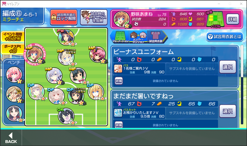美少女育成サッカーゲームアプリ『ビーナスイレブンびびっど!』で11月24日から始まる復刻イベント「或ル洋館ニテ」の招集メンバーです。 GK ロトン(20823試合16点) DF 桜木りょう(7681試合25点) ※微特効 嫋八女ふみ(29418試合654点) エヴァ(38018試合1934点) ヴァレリー(37482試合685点) MF 鳴海りな(24047試合540点) 御縁いおり(407試合0点) ビャクシニ(19855試合80点) ※微特効 谷城かなみ(14843試合38点) 野咲あまね(224試合0点) ※パネル FW 速水つばさ(23171試合40300点) 控え 飯綱みれい(48271試合109点) 小松菜れな(29187試合6469点) ハッカ2号(12178試合15点) 最近のイベントに比べると貧相なスタメンになりました…。 姫川あゆり選手の…モーションスカウトで…爆死をした挙句…追いのスカウトでも爆死して…イベスカ分がなくなりました…。 | ||