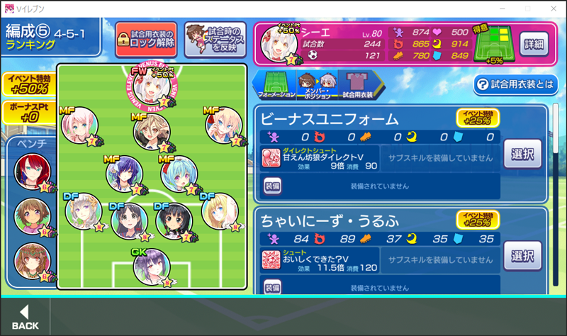 美少女育成サッカーゲームアプリ『ビーナスイレブンびびっど!』で12月4日から始まるイベント「Holy Night Judgement」の招集メンバーです。 GK ミラ(14139試合0点) DF 桜木りょう(7883試合25点) 飯綱みれい(51120試合109点) エヴァ(38363試合1962点) ヴァレリー(37827試合685点) MF 時乃ゆか(14424試合162点) 重野ゆうか(12755試合159点) 小松菜れな(29389試合6469点) 黒鋼アゲハ(8721試合6886点) 青葉ユズ(15108試合711点) FW シーエ(244試合121点) ※特効 控え 華厳院やえ(0試合0点) 采円あずみ(0試合0点) 美月カレン(0試合0点) こんな感じのラインアップになったので、ランキングの上位報酬は断念せざるをえないですね。 問題は中旬の復刻イベントの内容とシール交換の対象選手が誰になるのかということ。 シール750枚なら何とかできそうでも、それ以上となると…ヤバイ。。。 | ||