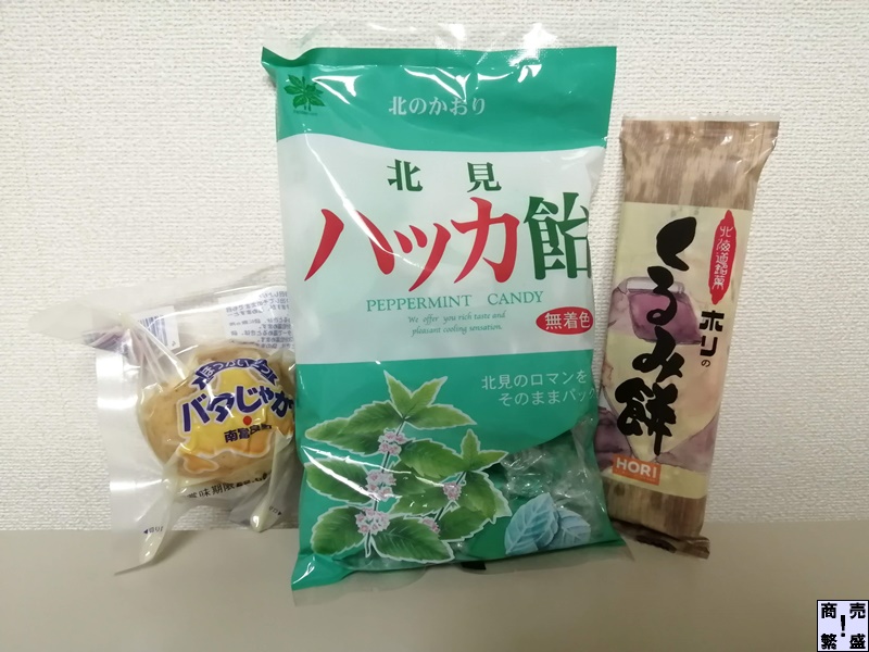 2月26日になんばCITY内にオープンしたご当地銘品うまいもの祭りで購入したハッカ飴、くるみ餅、バタじゃが。