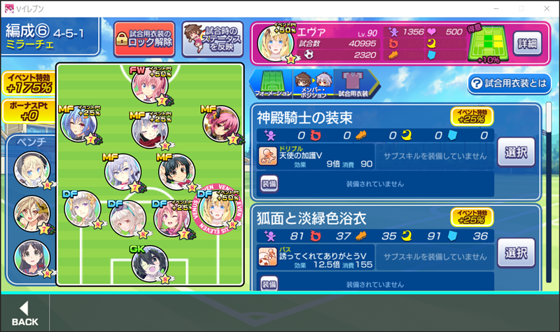 美少女育成サッカーゲームアプリ『ビーナスイレブンびびっど!』で3月25日から始まる復刻イベント「Trouble Travel」の招集メンバーです。 GK ロトン(22627試合16点) ※ボーナス DF 黛エリカ(390試合0点) ※微特効 嫋八女ふみ(31034試合720点) ※ボーナス エヴァ(40995試合2320点) ※特効 ヴァレリー(40459試合777点) MF 鳴海りな(26543試合667点) 御縁いおり(1502試合0点) 熊田ミキ(9865試合2092点) ※微特効 谷城かなみ(15749試合38点) 花村りお(3062試合1937点) ※微特効 FW 如月めいか(327試合548点) ※特効 控え 飯綱みれい(59398試合112点) 小松菜れな(31646試合7559点) ビャクシニ(20602試合80点) “びびび”のイベントメンバー紹介の時はスクショ2枚、主にフォーメーションと(入手できれば)特効選手の構成で記してきましたが、今回は特効選手の良いスクショが2枚撮ることができたので、フォーマットを変えました(笑)! 如月めいか選手は久々に入手したびびっどモーション対応の特効選手。 そもそもモーションスカウトはハイリスクハイリターンなので、あまりチャレンジしないんですよね。 どうしても欲しい選手は、特効要素がなくても良いので無難にドリチケ交換するぐらいです。 今回は谷城かなみ選手がいたことと大好きな桜が舞っていたから11連だけやってみようという軽い気持ちで。 そういう訳で狙いのかなみ選手ではなかったのですが、この衣装には絶対に夜桜が合うと思っての撮影をしました。 続いては今回のイベスカで入手したエヴァ選手。 以前から“エヴァレリ(エヴァ選手とヴァレリー選手のコンビ)”推しを公言していたのでこれは大当たりなのですが、実は今回ばかりは高倍率のパススキルを持ったビャクシニ選手狙いでした。 物欲センサーって凄いですよね。。。 日記にはめいか選手を載せることでほぼほぼ決まっていたのですが、このお菓子衣裳にはどんな背景が似合うのかなぁと試してみることに。 盾(?)が壊れかかっていることもありダークであったり戦闘っぽい背景をピックアップしていた時に、びびびでよく登場する厨房の背景を思い出して合わせてみると…エヴァ選手が目を閉じて泣いているような表情になったのです。 これはドラマがありそうなスクショができたということで、どちらも捨てがたく、今回はフォーマット改変という力技に出たわけです(笑) | ||||