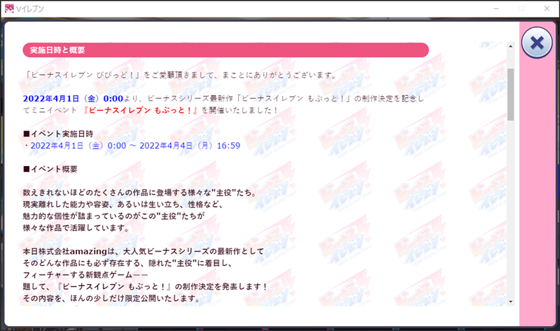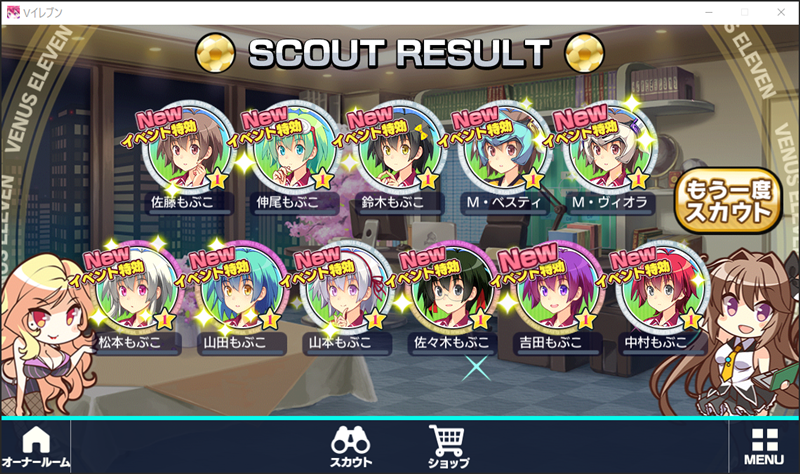 なんと株式会社アメージングから新作アプリ『ビーナスイレブンもぶっと!』のリリースが発表されました! というのが、今年のエイプリルフールネタでした(笑) びびびのエイプリルフールは結構凝っていて、これまでは前年度に流行したゲームなどをベースにしていることが多かったですね。 そして、更に凄いのがそのネタがまさかのコラボイベントまで昇華しているということです(公式・非公式問わず)。 今年は何をネタにしてくるかとワクワクしながら、アプリを起動させると、、、まさかのもぶこ! もぶことは、名前から推察できるようにびびび内でのモブキャラクターです。 髪型や髪色違いでいろんなもぶこがびびびには登場しています。 今までシナリオで少し絡んでくることはありましたが、こうやって主役になる日が来るとは…オーナー歴が長い人こそ感慨深いのではないでしょうか。 初回無料で回せたもぶこスカウトは見事にNEWの嵐でした。 | ||||