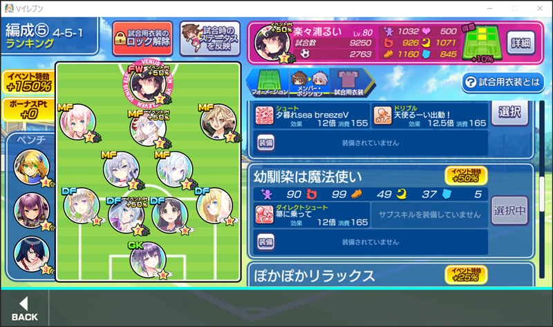 美少女育成サッカーゲームアプリ『ビーナスイレブンびびっど!』で5月4日から始まるイベント「願に灯す導きの火」の招集メンバーです。 GK ミラ(16136試合0点) DF 飯綱みれい(60279試合114点) アルセーネ(700試合2点) ※特効 エヴァ(43988試合2361点) ヴァレリー(41454試合783点) MF ウルリカ(1255試合4点) 御縁いおり(1791試合7点) フレイヤ(1983試合1178点) ※特効 小松菜れな(32527試合7829点) 青葉ユズ(16560試合843点) FW 楽々浦るい(9250試合2763点) ※特効 控え アディーネ(0試合0点) 柴田勝家(0試合0点) ノエル(0試合0点) 今回は特効に楽々浦るい選手がエントリーされていたので、有償ビーナスハートも投入してのイベスカでした。 現在行われている6.5周年の記念施策の恩恵もありレアリティがレジェンドのフレイヤ選手は連続で出るのにるい選手が…。 何とか確保はできましたが、、、傷を負いました(笑) 普段なら特効選手が3人いれば上位報酬を狙える位置ではあると思いますが、今回はその施策によりビーナスハートの配布量が増えているので、自然回復だけでは食い込めなさそうな気がします。 |