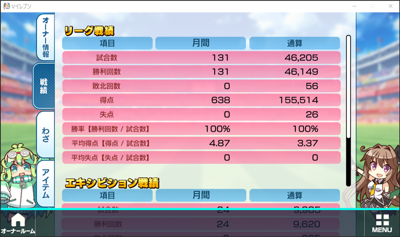 今日の戯言はずーっと前からやりたいなとは思っていたけれど、面倒になって先延ばしにしていたものです(汗) ただ、長くプレイしている『ビーナスイレブンびびっど!』が6.5周年を迎えたということもあり、今しかないと思ってまとめてみました。 個人的に“びびび”の魅力の1つにチームとしての戦績はもちろんのこと、個人成績がずっと累積されていくという楽しみがあります。 現実のサッカー選手ではまずありえないことですが、重用している選手の通算試合数が10000を超えるのはざらなことで、今日時点でししむぞのチーム「アキンドロイス」では飯綱みれい選手が60314試合に出場しています(笑) そして通算成績が可視化されているということで、全オーナーの中でのランキングも確認することができます。 そんな訳で、『商売繁盛!列島』的びびび6.5周年祝いは、アキンドロイスでいわゆるトップチームとして起用している28選手の通算成績とそのランキングを書き留めておく戯言としたいと思います。 |