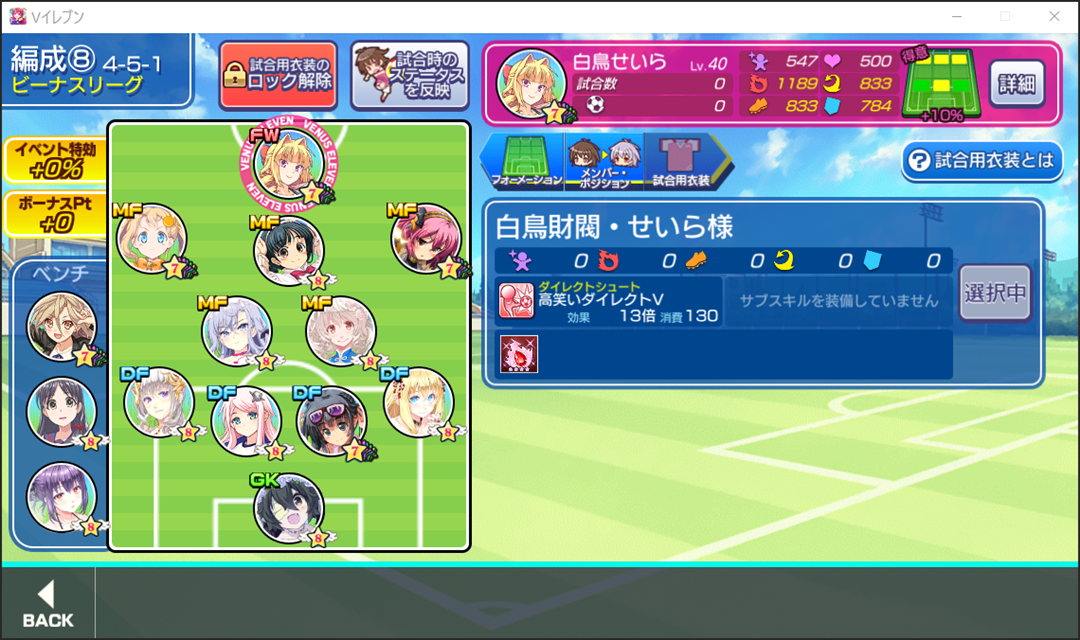 美少女育成サッカーゲームアプリ『ビーナスイレブンびびっど!』で7月1日から始まったイベント「ビーナスリーグ」の招集メンバーです。 GK ロトン(23739試合18点) DF 桜木りょう(9461試合101点) 青葉ユズ(17890試合1131点) エヴァ(50310試合2988点) ヴァレリー(45096試合1174点) MF 嫋八女ふみ(32801試合770点) 御縁いおり(2663試合75点) 鳴海りな(28742試合763点) 谷城かなみ(16296試合39点) ソナタ(20252試合1368点) FW 白鳥せいら(0試合0点) ※パネル 控え ミラ(17609試合0点) 飯綱みれい(61880試合322点) 小松菜れな(34128試合8802点) 約1ヶ月ぶりの編成紹介。 ただ、あの時とはびびびを取り巻く環境は全く違ってしまい。。。 今回のビーナスリーグはイベントとはなっているものの終了期限はないので、実質的に通常リーグのラストにアーチェ杯要素を混ぜたという感じでしょうか? 編成についてはほぼいつものメンバーですが、パネルボーナス要員で白鳥せいら選手を初起用しました。 今まではずっと経営を頑張ってくれていました(笑) この編成紹介を記す前に最初のストーリーだけは見ましたが、多くの選手たちの中に飯綱みれい選手の姿も! まぁ…これでこの後どんな感じで展開していくかが想像できますが、ハンカチ必須というやつですね(涙) |