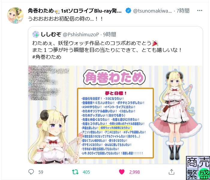 今日は推しの角巻わためさんが以前から夢だと語っていた妖怪ウォッチのアプリゲームとのコラボが決まったというニュースを知って、お祝いの呟きとたまたま手元に残していた初配信の時の画像を引っ張り出して、ししむぞは仕事へと向かったのです。