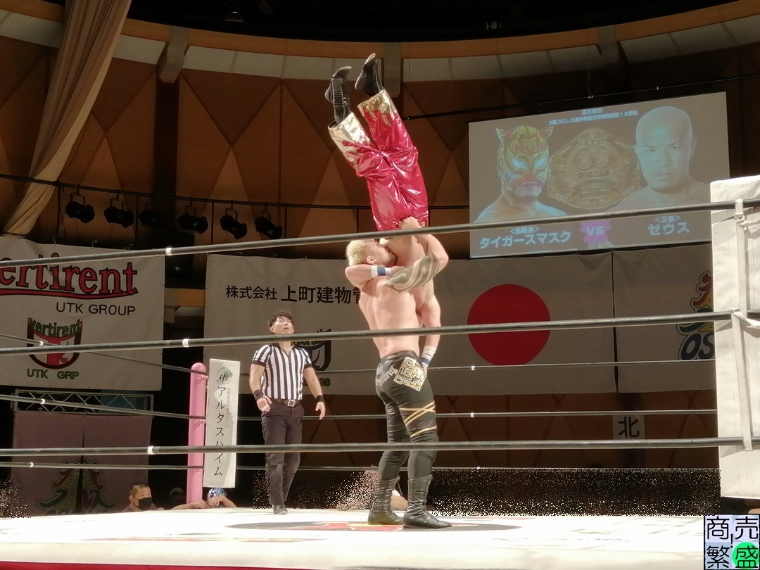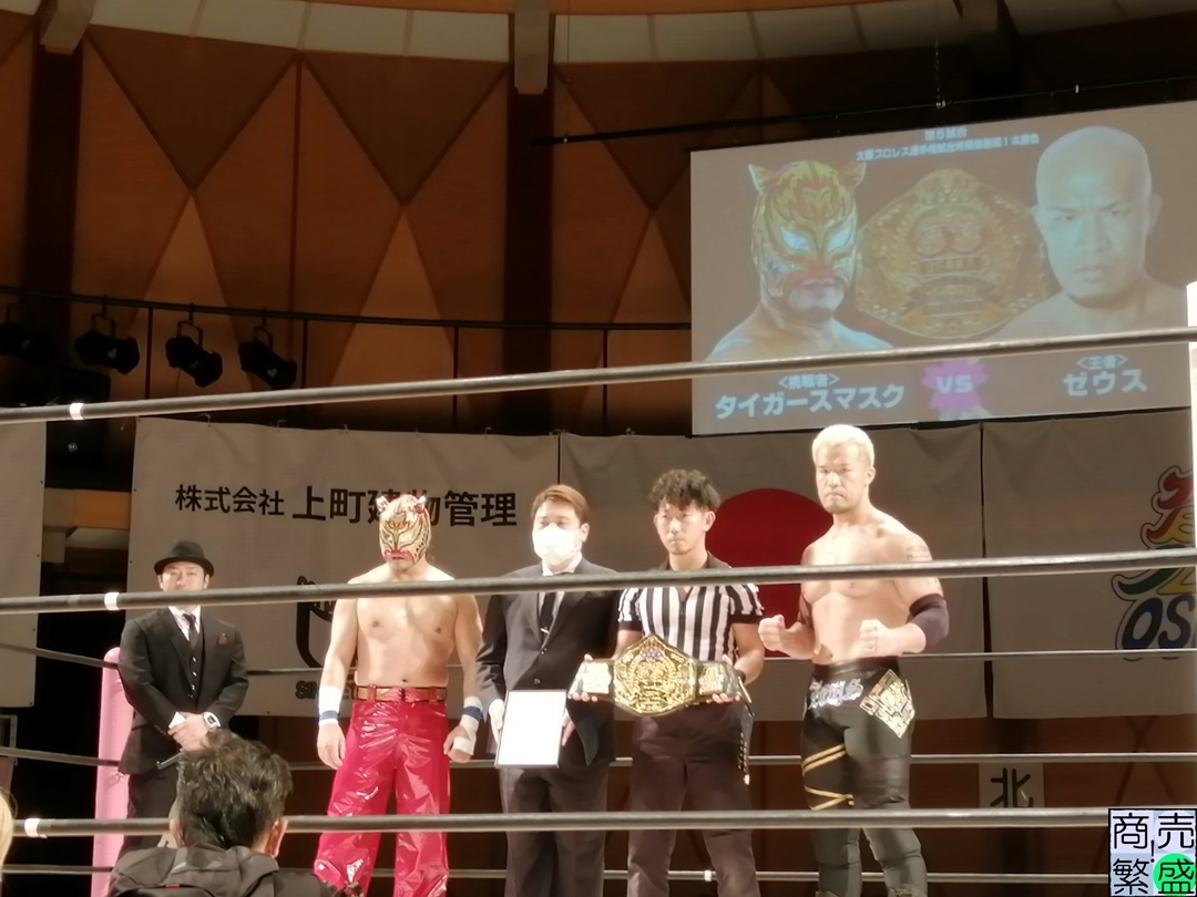 メインイベントは前述しましたが、大阪プロレス王者のゼウス選手に天王山覇者であるタイガースマスク選手が挑戦するタイトルマッチです。