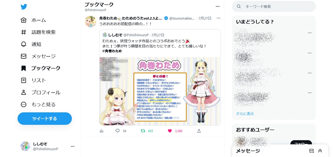 普段からししむぞは軽率なツイートしかしていないのですが、この日はわためぇが夢の1つに掲げていた『妖怪ウォッチ』とのコラボが発表されたので、おめでとうの言葉と初配信時のスクショを添えてツイートして仕事へと向かいました。