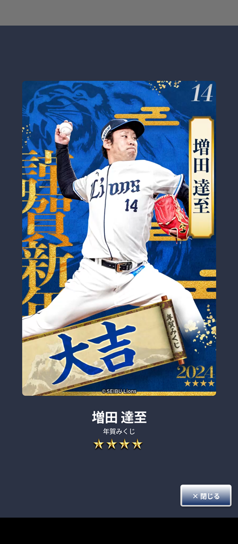 新年最初の新デザインカード“年賀みくじ”に増田達至投手は☆4の大吉としてラインアップされました。