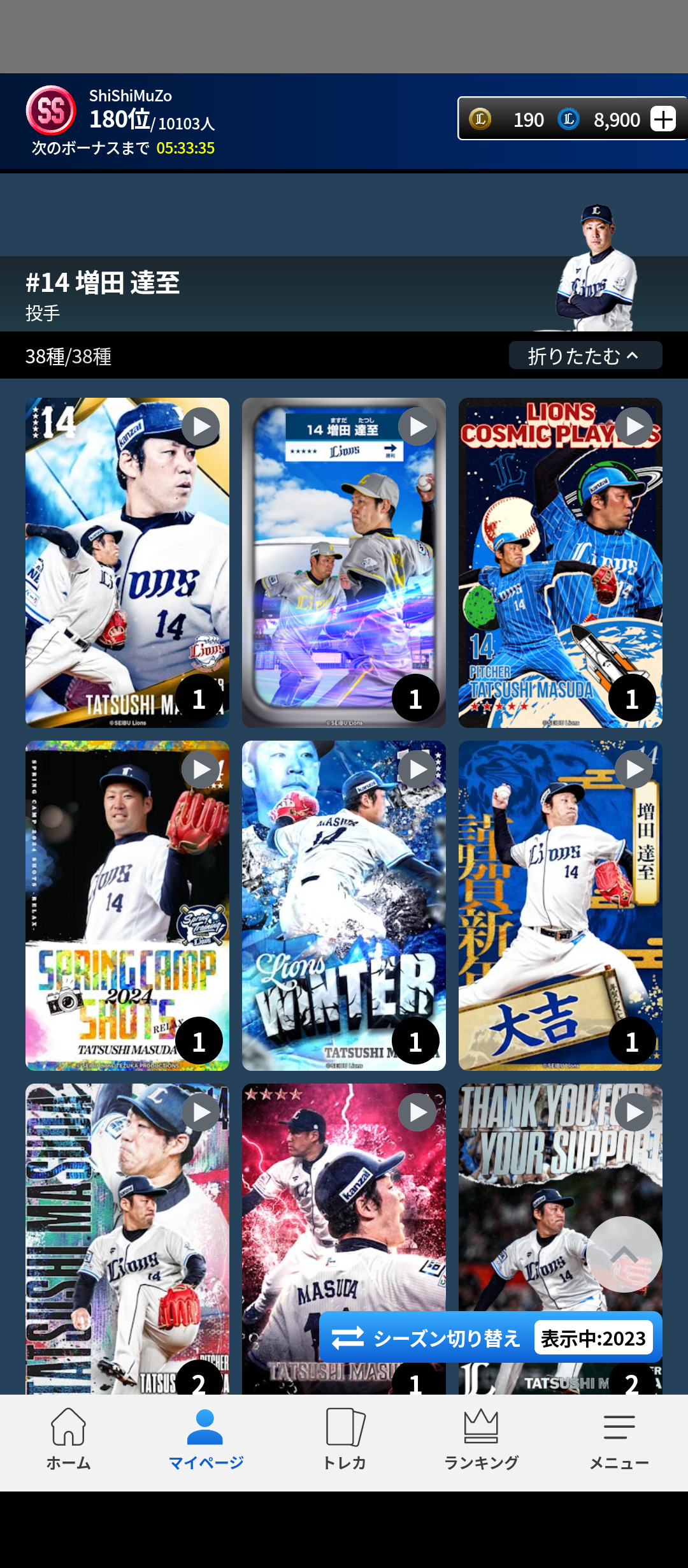 ただ2023シーズンは応援する側としてはあまり嬉しくはないのですが…成績があまり振るわなかったこともあり、記録達成カードの発行もなく、高レアリティのカードも少なめでしたので順調に集めることができていました。