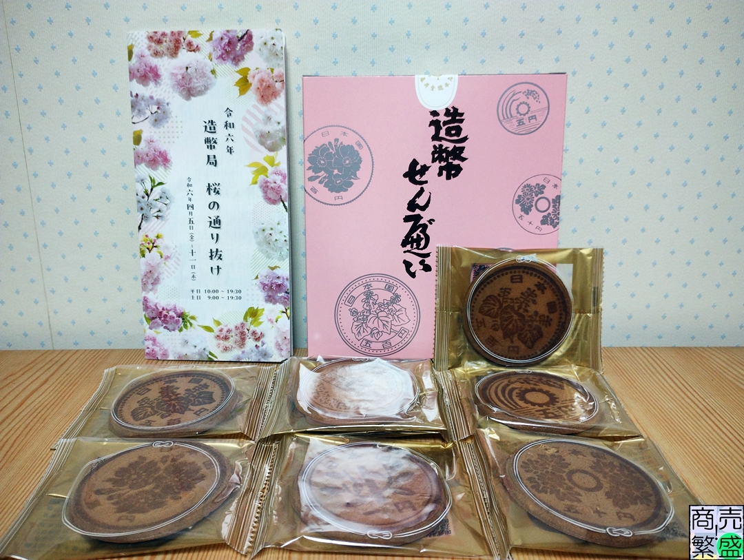 現行の硬貨6種類のデザインが焼き付けられたせんべいが8枚入って販売されていました。