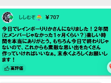ししむぞはりりかさんのデビュー時から知っているわけではないので、バッジがレインボーの先達は既にたくさんおり、羨望の眼差しで見ていましたが、その仲間入りを果たし本当に嬉しいです。
