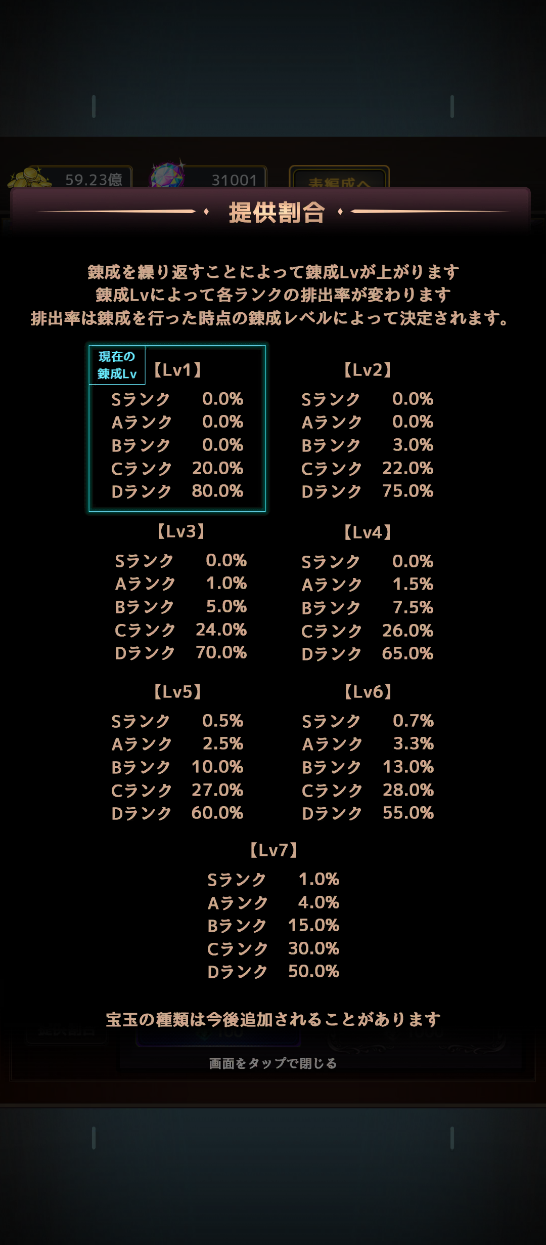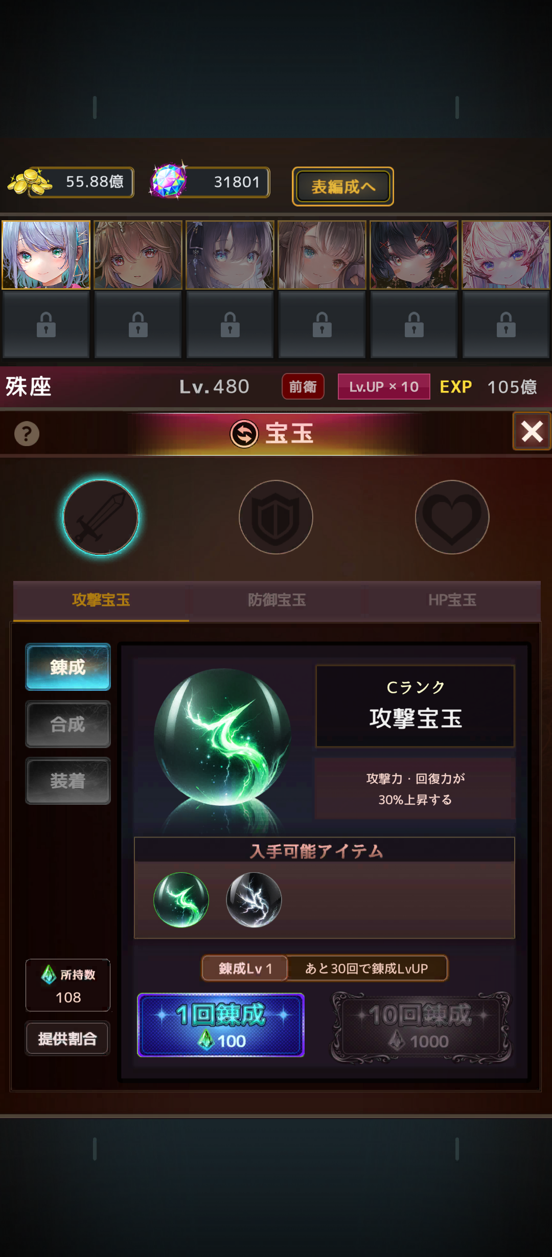しかし等級が5つある宝玉の最高ランクを獲得するためには錬成(宝玉のガチャ)のレベルを上げる必要があり、錬成のレベルを上げてかつ極めて低い入手確率との勝負になるわけです。