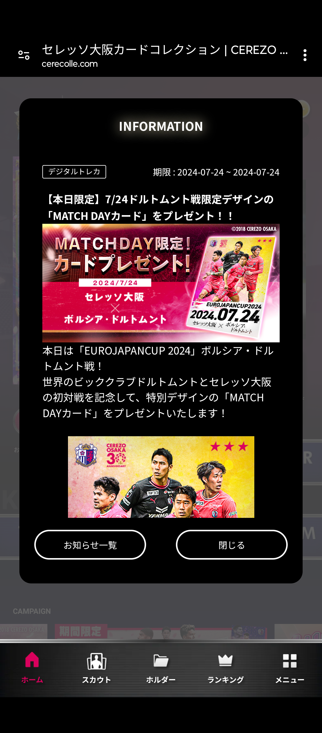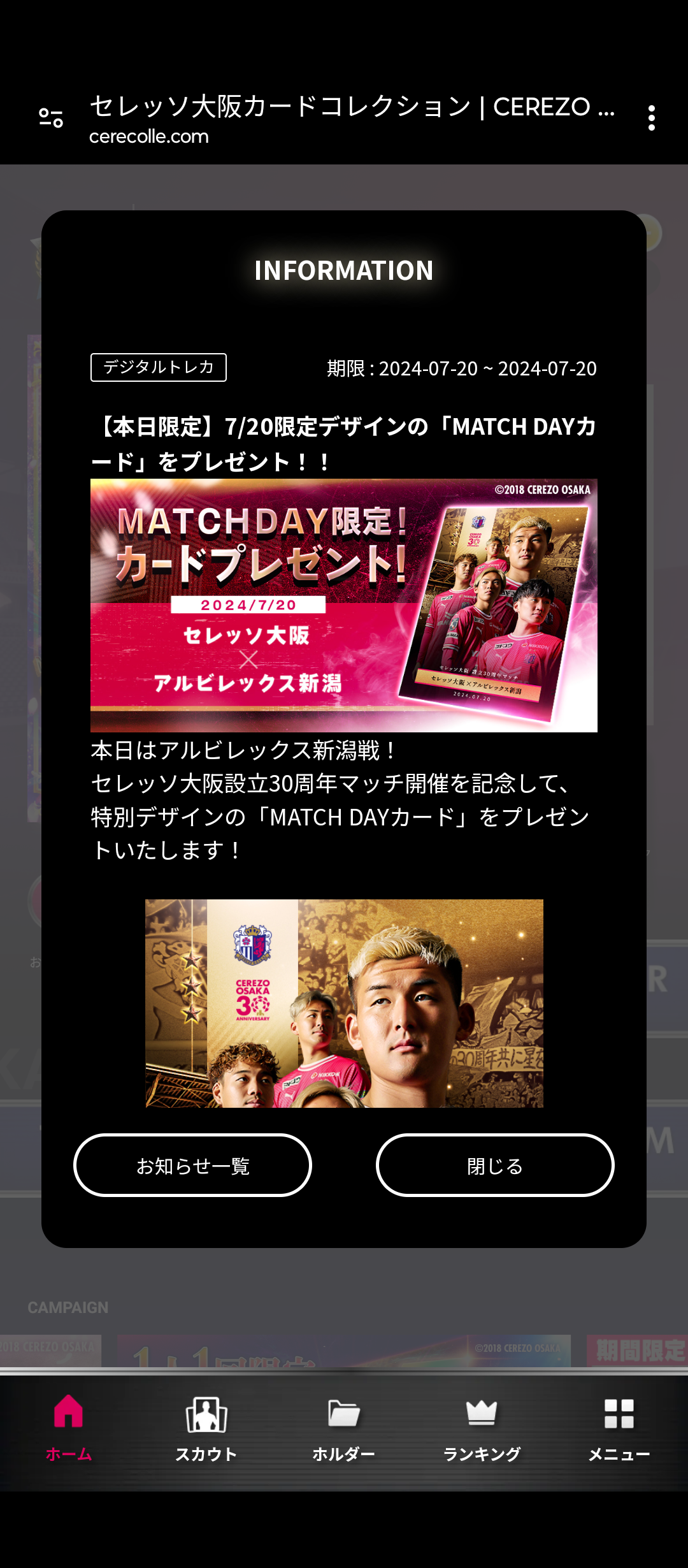20日に行われた新潟戦は設立30周年マッチと銘打たれてログボで特別なカードが貰えましたが、スタジアム来場者限定で配布されたカードのシリアルコードをセレコレで入力すると同じカードが入手できる企画もありました。