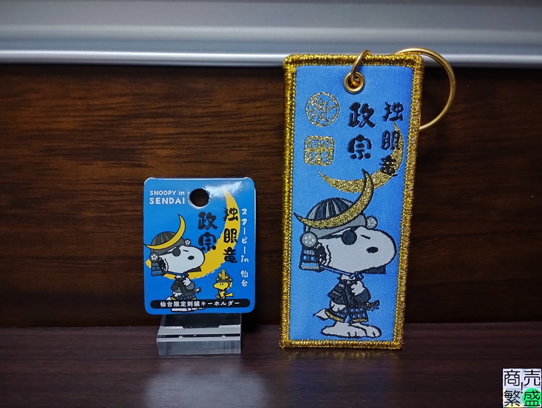 スヌーピーが“独眼竜 政宗”風の出で立ちをした仙台限定の刺繍キーホルダー。