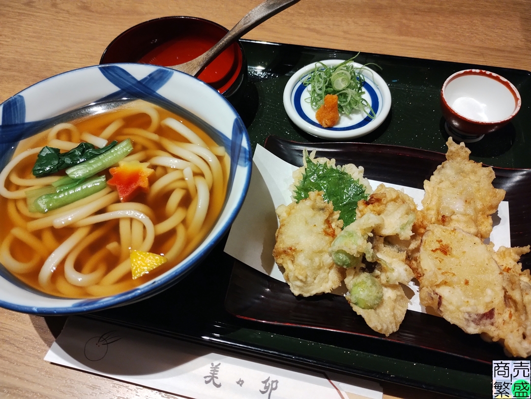 美々卯の“牡蠣と野菜の天ぷらうどん”。