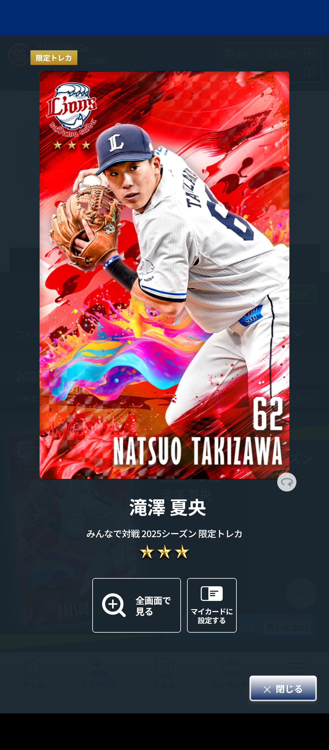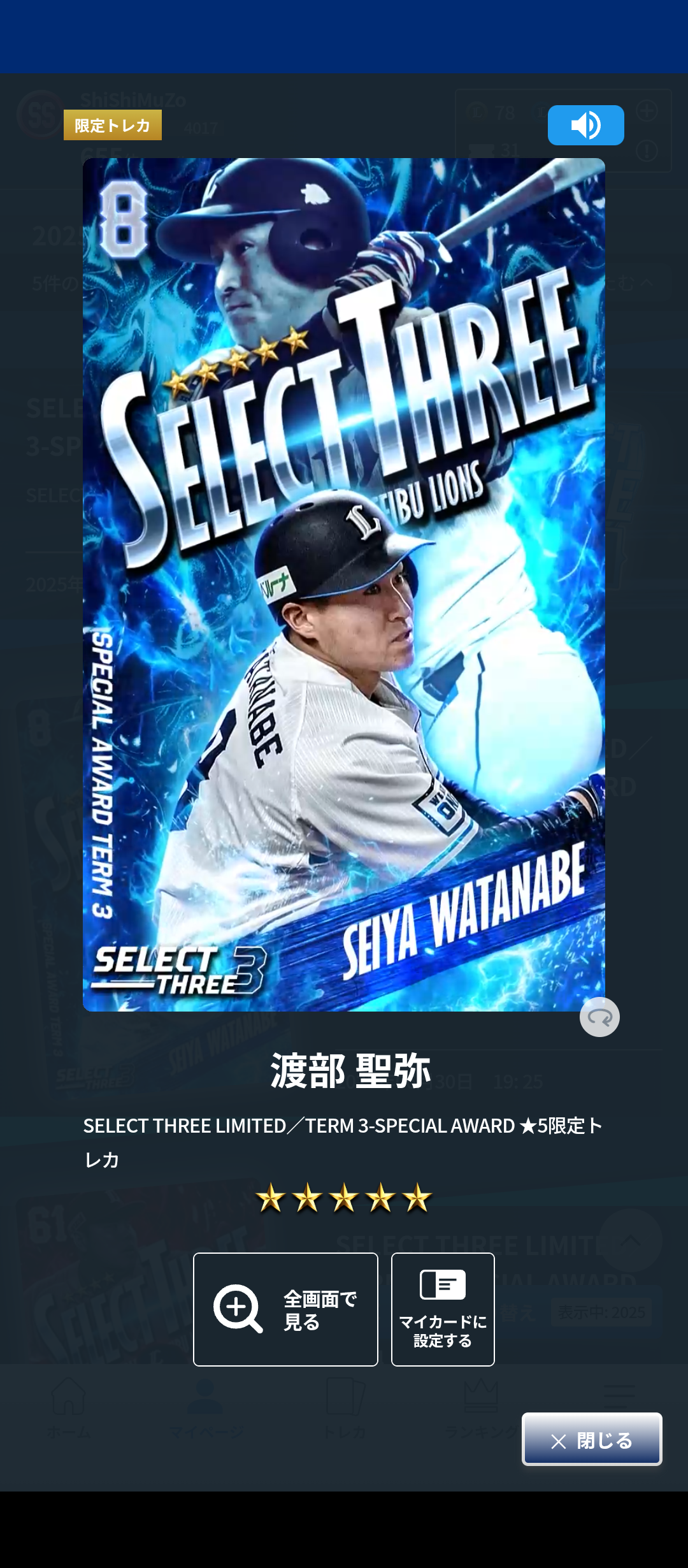 渡部選手の☆5カードは既に所持していましたが、初めてのセレクトスリーでの最上位報酬として思い出のカードがまた1枚増えました。
