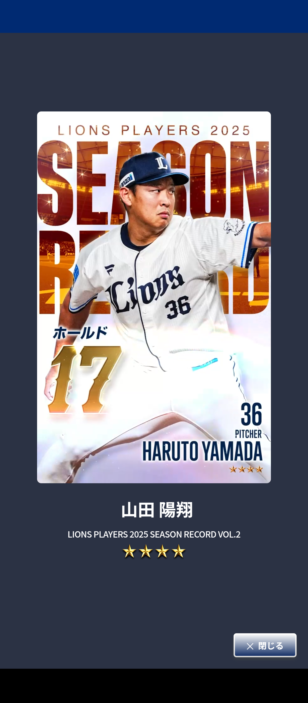 今季の突出した成績を記した“LIONS PLAYERS 2025 SEASON RECORD”には山田陽翔投手が登場し、ホールド数が取り上げられました。