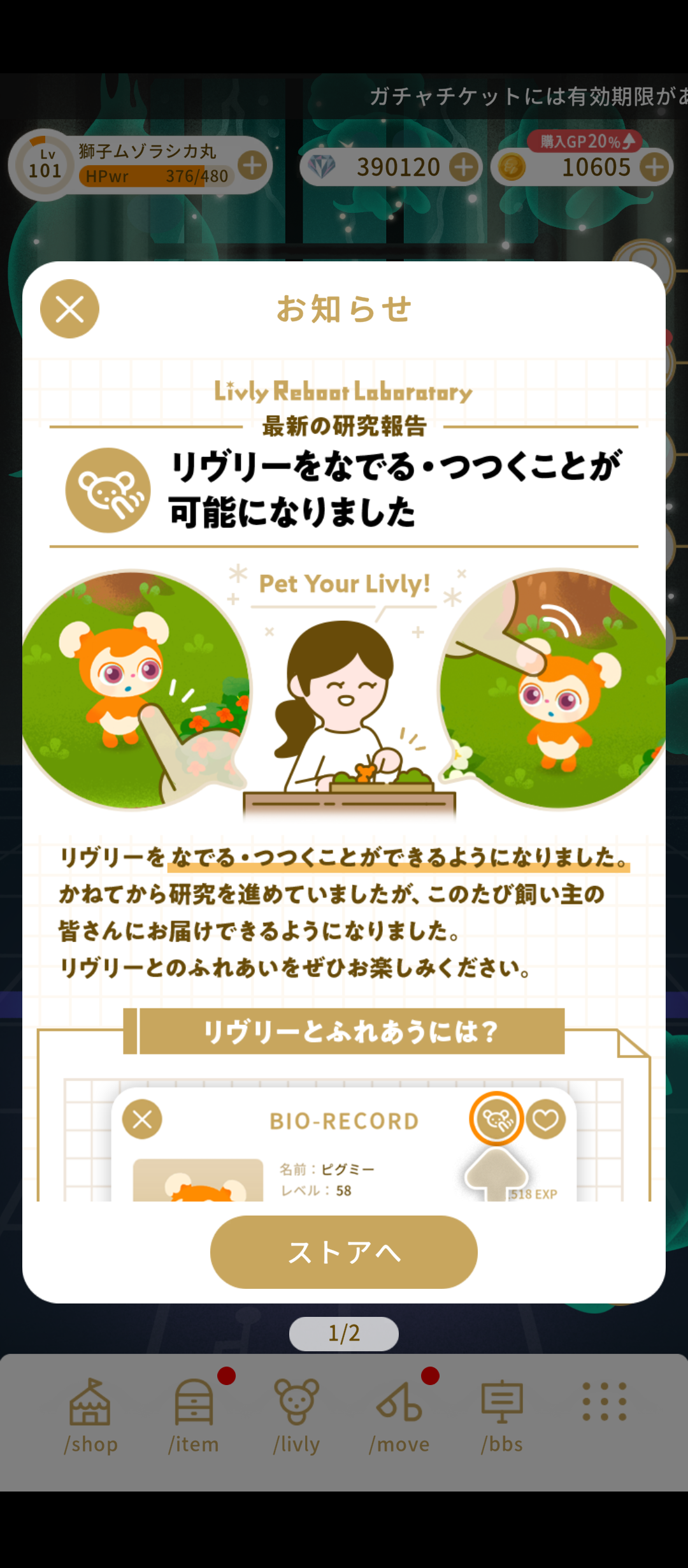 それでもリヴリーの世界には新たな機能である“なでる”と“つつく”といったコミュニケーションが追加され、より親近感を持ってお世話することができるようになりました。